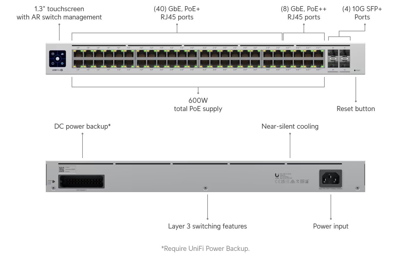 With PoE+ (802.3at) and PoE++ (802.3bt) support, the USW Pro 48 PoE delivers up to 600W of total PoE power. This makes it perfect for powering a variety of network devices directly over Ethernet cables, eliminating the need for separate power supplies or additional wiring. The inclusion of PoE++ means even high-powered devices like UniFi Protect G4 Pro cameras or Wi-Fi 6 access points can be powered reliably.